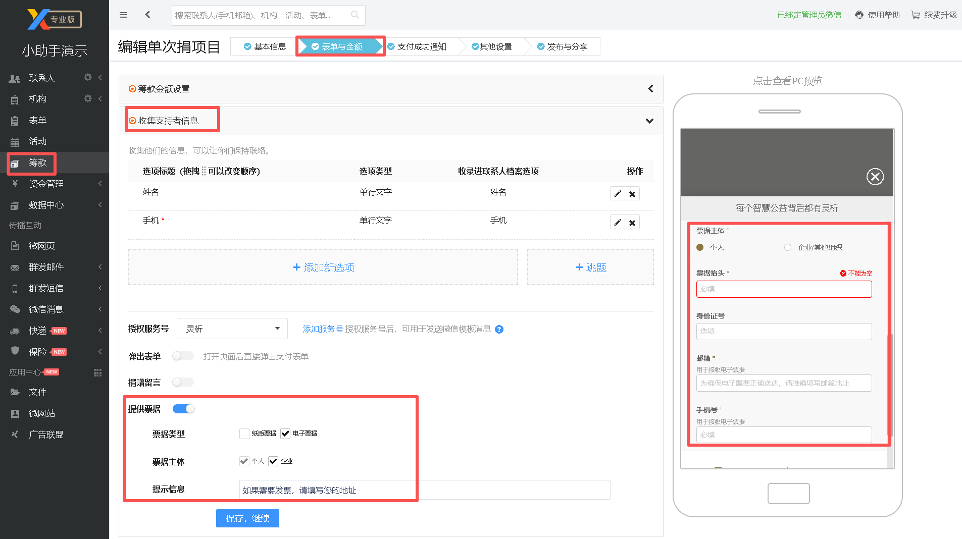 进入灵析,编辑筹款的「表单与金额」-「收集支持者信息」>「提供票据」,在「提示信息」里填写即可
